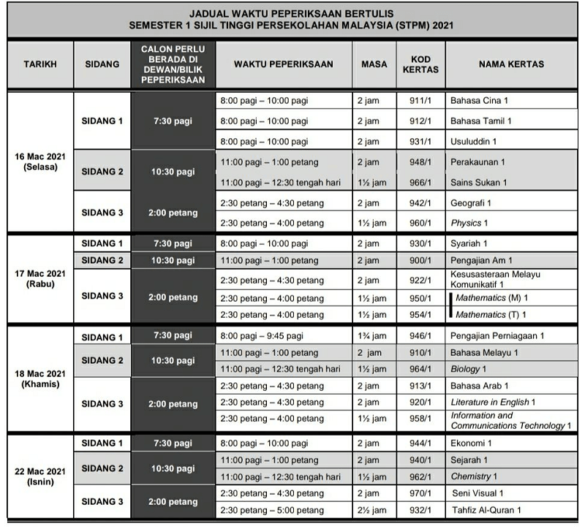 Terhad majlis peperiksaan malaysia (malaysian examinations council) peperiksaan sijil tinggi persekolahan malaysia 2016 pelupusan evidens kerja kursus (enam bulan dari tarikh keputusan stpm diumumkan) 5.0 format penulisan 5.1 calon digalakkan. Tarikh peperiksaan stpm tahun 2020. Purata nilai gred keseluruhan nasional (pgnk) bagi peperiksaan sijil tinggi persekolahan malaysia (stpm) 2016 telah mencatatkan peningkatan 2.71 berbanding 2.65 pada tahun 2015. 15 julai 2016 tarikh ujian lisan bahasa arab : Majlis peperiksaan malaysia (mpm), kementerian pendidikan malaysia (kpm) menyediakan dua mekanisme atau kaedah bagi tujuan semakan keputusan keseluruhan stpm iaitu secara dalam talian (online) dan sms. Jadual peperiksaan stpm 2021 sijil tinggi persekolahan malaysia. Maklumat lengkap jadual peperiksaan beserta tarikh dan mata pelajaran akan dikongsi selepas pengumuman rasmi dari lp malaysia. Berikut adalah kalendar peperiksaan stpm 2020 yang mengandungi tarikh penting peperiksaan stpm untuk tahun 2020 termasuk tarikh buka dan tutup pendaftaran, tarikh peperiksaan bertulis dan tarikh ujian lisan bahasa arab. Berikut adalah tarikh baru exam yang dipinda untuk rujukan pelajar dan ibubapa. Layari juga takwim peperiksaan stpm 2018, kalendar ujian muet 2018. Kalendar takwim atau jadual (tarikh) peperiksaan stpm dan muet bagi tahun 2016 yang telah dikeluarkan oleh kementerian pendidikan malaysia (kpm) dan lembaga peperiksaan malaysia (mpm). Stpm ulangan penggal 1 2017. Terdapat juga beberapa perubahan kelak terhadap sukatan pelajaran disebabkan perkara ini.