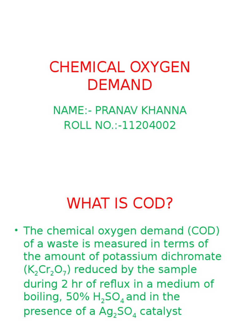 Chemical oxygen demand or cod is a measurement of the oxygen required to oxidize soluble and particulate organic matter in water. The chemical oxygen demand (cod) test is commonly used to indirectly measure the amount of organic compounds in water. Section group abstract the purpose of this experiment is to demonstrate the principle of determining the. In environmental chemistry, the chemical oxygen demand (cod) is an indicative measure of the amount of oxygen that can be consumed by reactions in a measured solution. Chemical oxygen demand laboratory four cive 327: The quantity of oxidant consumed is expressed in terms of its oxygen equivalence. Determinations can be made titrimetrically by several approved methods, or photometrically (colorimetrically) with epa method. Biological oxygen demand ( b.o.d) introduction: The higher value of chemical oxygen demand indicates the higher organic pollution in the water sample. For environmental engineers and others in the. From wikipedia, the free encyclopedia. A discussion of bod and how to monitor it is included at the end of this section.) biochemical oxygen demand, or bod, measures the amount of oxygen consumed by microorganisms in bod also measures the chemical oxidation of inorganic matter (i.e., the extraction of oxygen from water. Most applications of cod determine the amount of organic pollutants found in surface water (e.g.