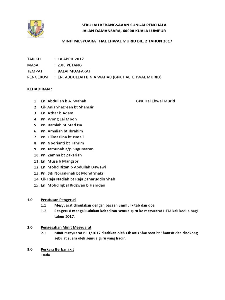 Contoh Minit Mesyuarat Mudah Dan Lengkap Jawatan Kosong from www.jawatankosong.net Contoh minit mesyuarat persatuan ibu bapa dan guru. Minit mesyuarat panitia bahasa melayu kali kedua. Makluman 2.0 pembentangan dan pengesahan minit mesyuarat yang lalu 2.1 minit mesyuarat program hijaukan bumi kali 1/2019 dibentangkan dan disahkandengan beberapa pindaan seperti yang berikut: Minit mesyuarat guru kali kedua skfk2. 100%(2)100% found this document useful (2 votes). Use the download button below or simple online reader. So please help us by uploading 1 new document or like us to download Sekian sahaja perkongsian kami dalam posting kali ini.